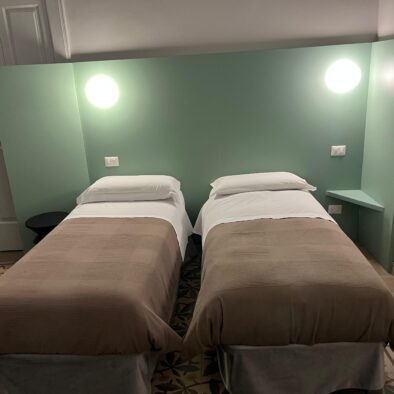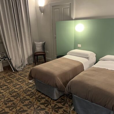 La camera è composta da una camera matrimoniale o doppia ed un bagno. Si affaccia sul balcone centrale del palazzo ed è dotata di: 1. Smart TV 40 pollici con collegamento satellitare e NETFLIX; 2. telefono; 3. collegamento Internet Wifi gratuito; 4. aria condizionata; 5. cassaforte digitale; 6. frigo-bar;
