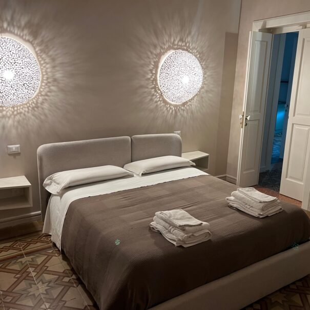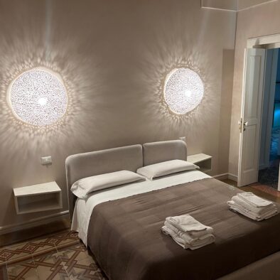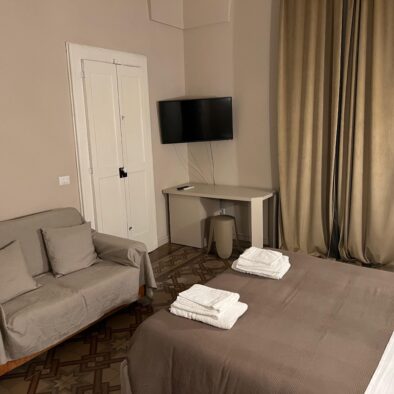 La camera è composta da una camera matrimoniale ed un bagno. Si affaccia sul balcone centrale del palazzo ed è dotata di: 1. Smart TV 40 pollici con collegamento satellitare e NETFLIX; 2. telefono; 3. collegamento Internet Wifi gratuito; 4. aria condizionata; 5. cassaforte digitale; 6. frigo-bar;